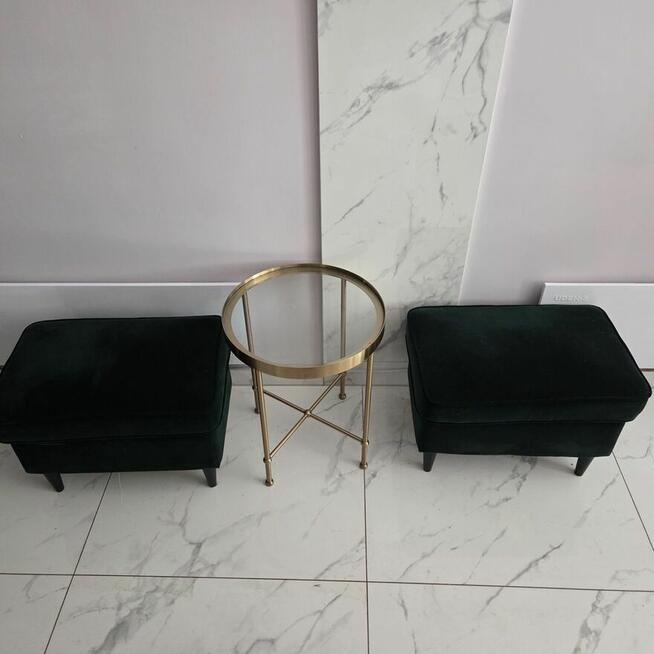 Nowoczesny zestaw: 2 szklane stoliki i 2 pufy w eleganckim, minimalistycznym stylu. Idealne do salonu lub sypialni, dodając ...
