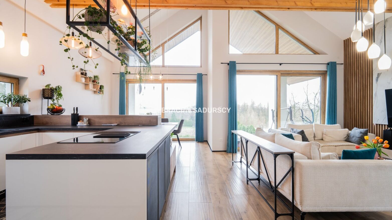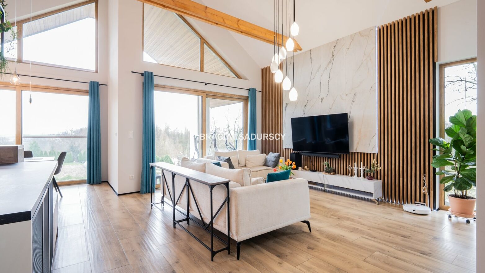 Przestronny, wysoki salon (wysokość 5,57 m) z kompletem wypoczynkowym, stołem jadalnianym i wyjściem na taras (taras do własnej aranżacji i wykończenia)