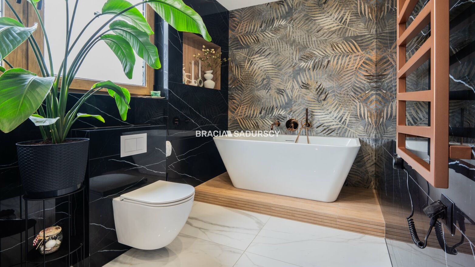 Stylowa łazienka z wolnostojącą wanną, toaletą i dużym lustrem